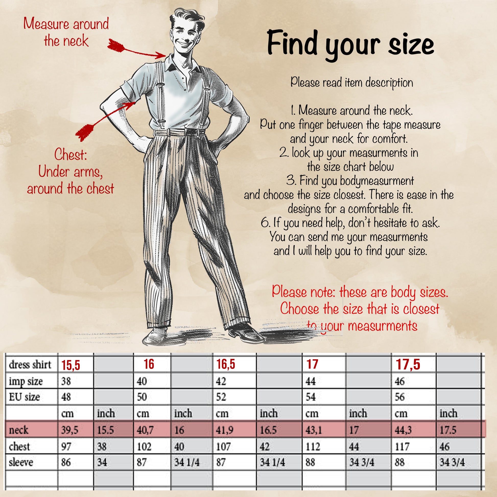 The sizes are collar sizes in inches. When measuring add 1/2 inch for comfort and choose your size accordingly. The sleeve length is normal to long. In the past shirts were made with only one length of sleeves. For an original vintage look wear the shirt with sleeve holders.